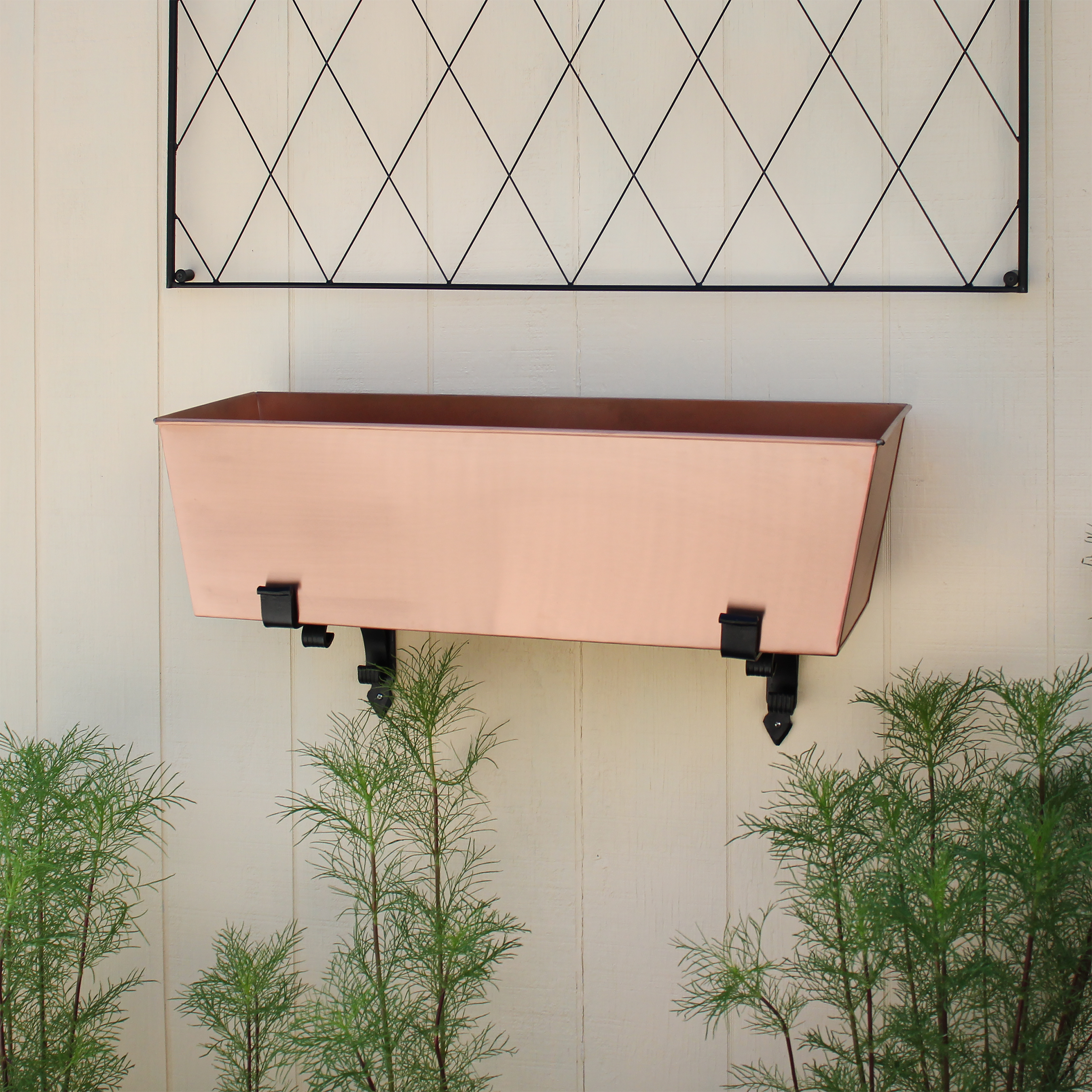- This tapered rectangular flower boxes has a rolled edge, smooth antique copper finish and a simple classic style, drainage holes are provided with rubber plugs