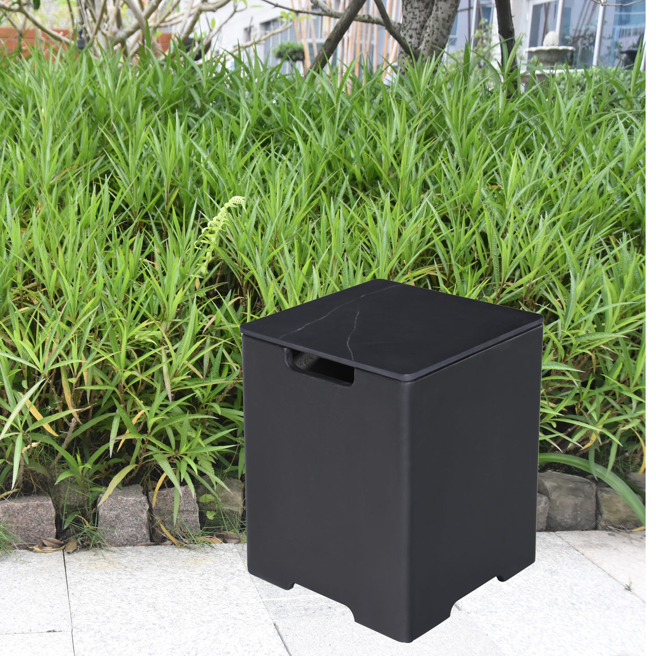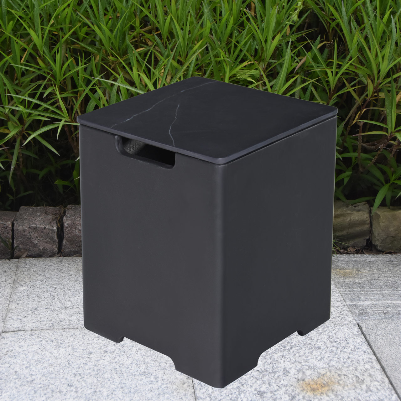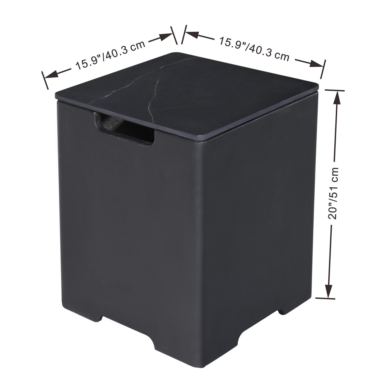 Conceal your propane tank in refined style with this beautifully crafted tank cover, featuring a sleek honed marble porcelain top and a durable GFRC (glass-fiber reinforced concrete) base. With its contemporary design and premium materials, this tank cover doubles as a small side table—perfect for elevating your outdoor setup. Measuring 15.9 x 15.9 x 20.5 inches and weighing 48.4 lbs, it’s substantial yet easy to integrate into your patio layout. The removable top allows for quick access to the tank, blending function with elegance for a seamless outdoor experience. WARNING: This product can expose you to chemicals known to the State of California to cause cancer and birth defects or other reproductive harm. For more information, visit www.P65Warnings.ca.gov.