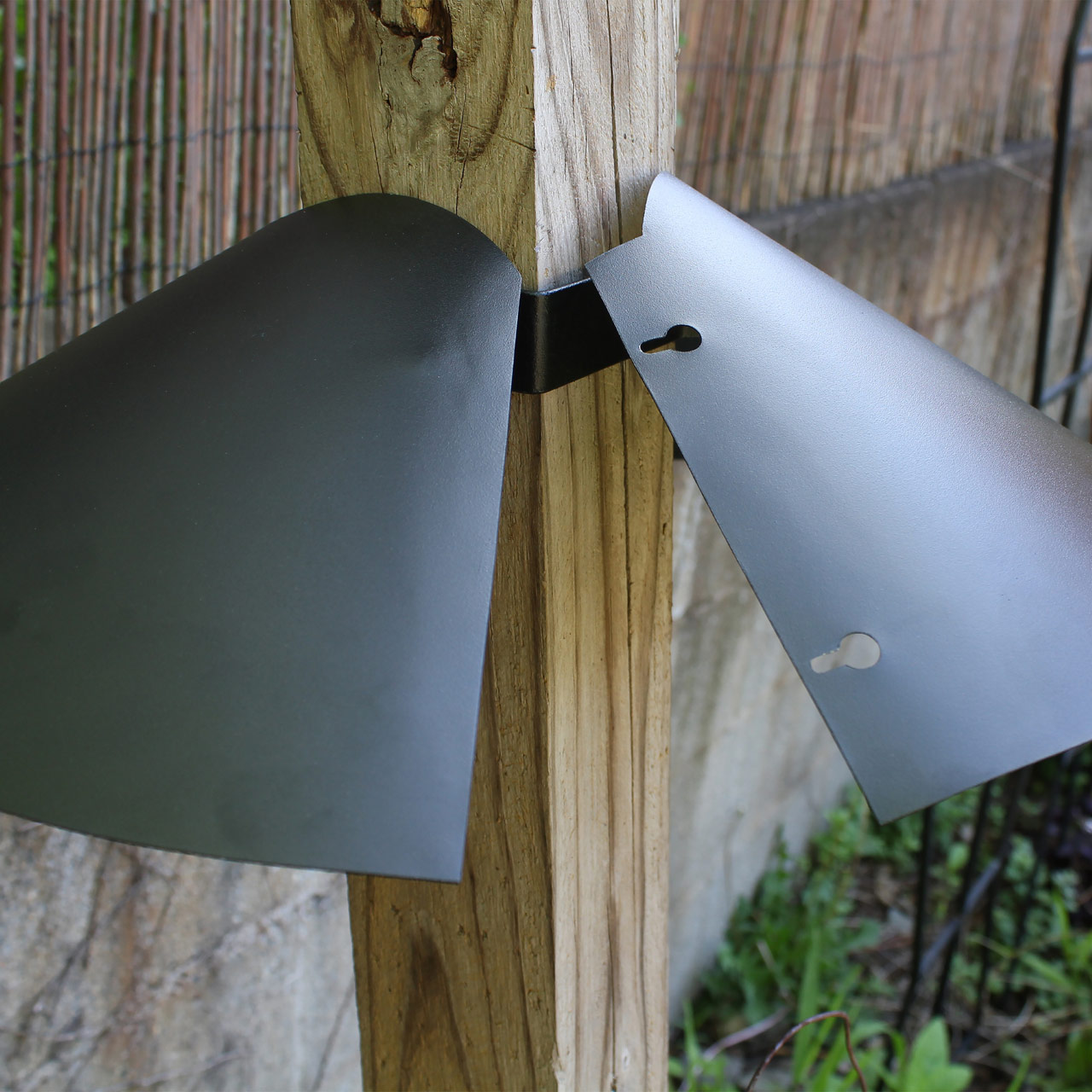 - Includes an adjustable post clamp to attach around 4x4 post, deflector can be opened and snapped into place.