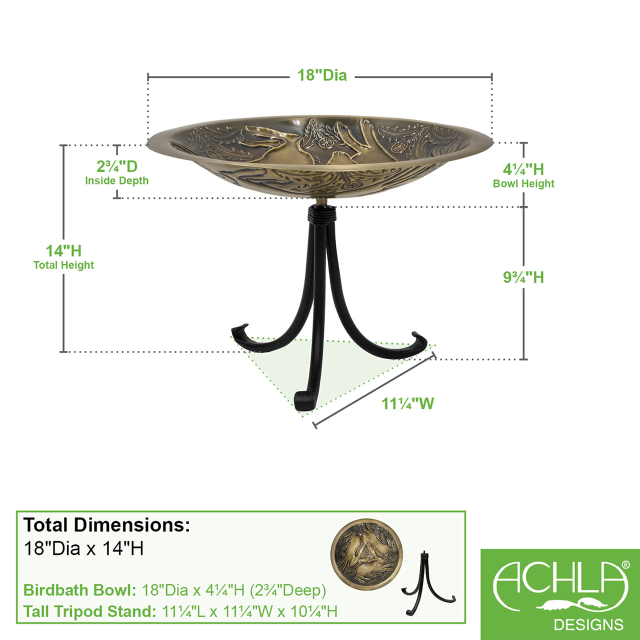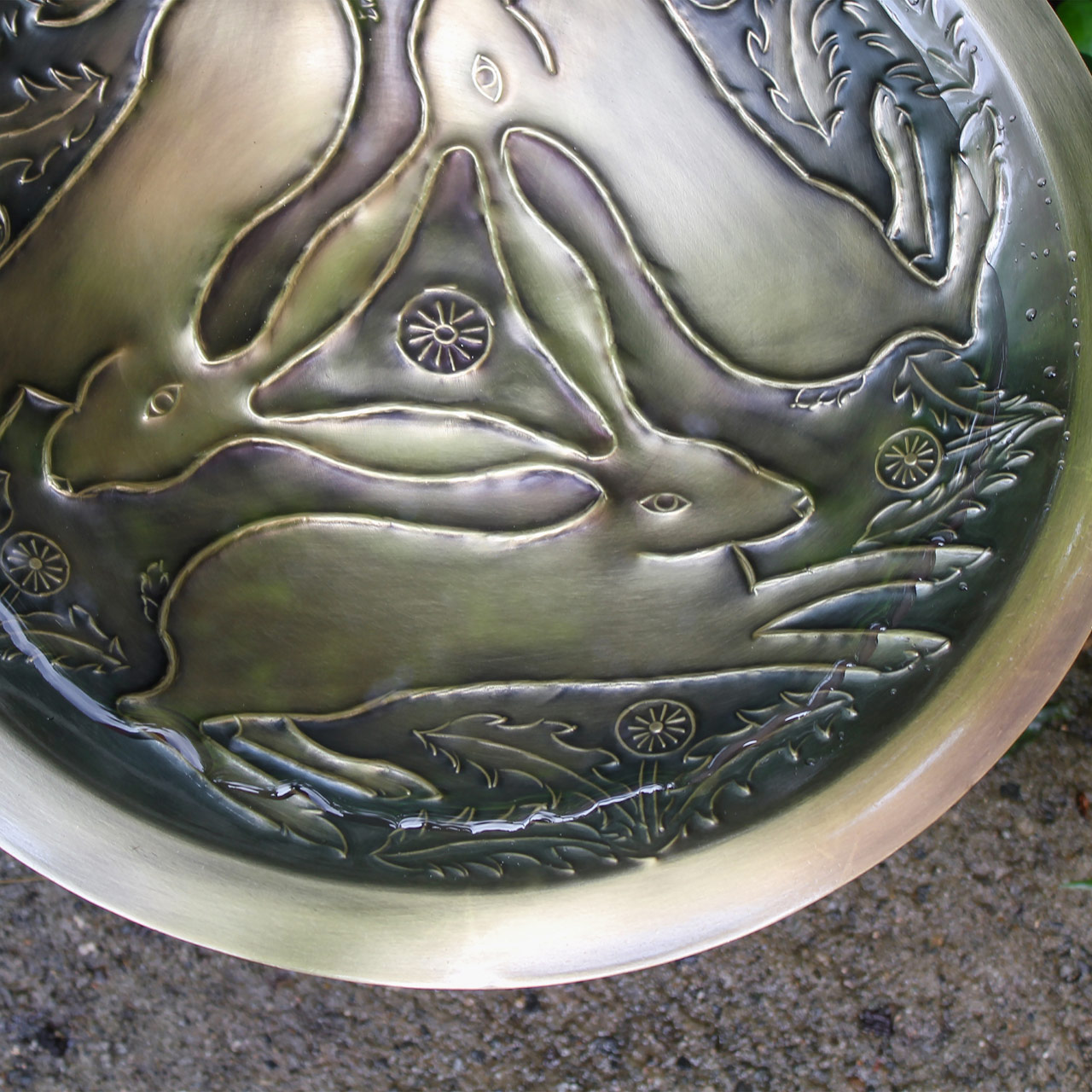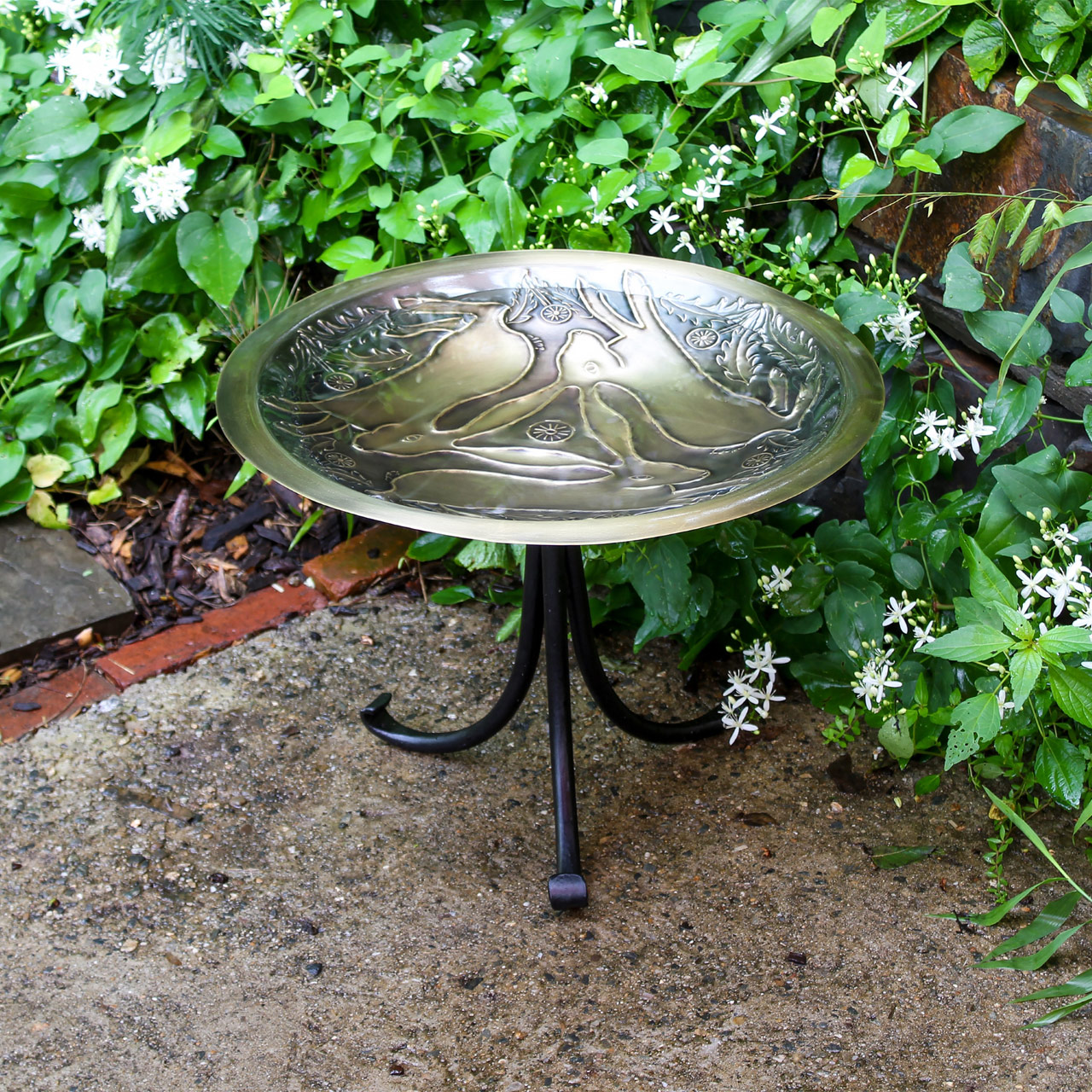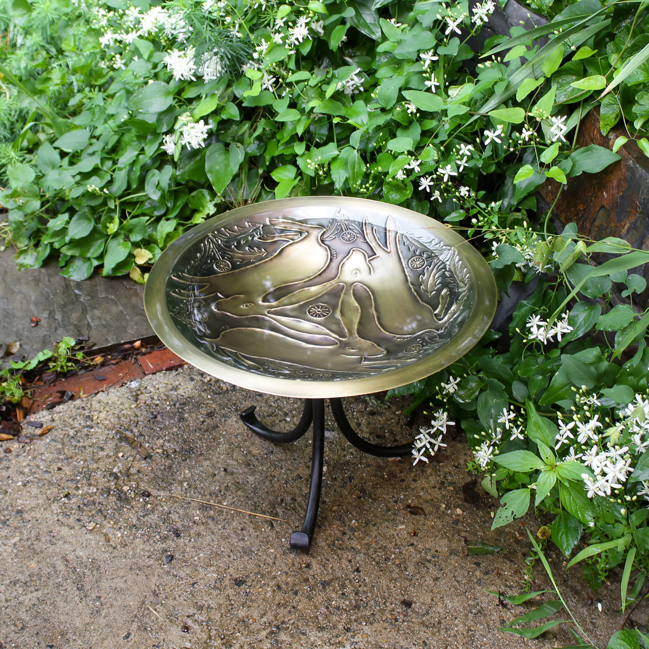 The Three hares design is a familiar ancient motif, found in sacred sites in the Middle and Far East, as well as Medieval churches of Devon, England. This curious pattern of rabbits with shared ears remains mysterious and open to interpretation, but will be at home in the garden. With the design done in embossed Brass, a threaded base on the underside of the bowl attaches to a sturdy three-footed wrought iron stand. This birdbath makes a beautiful garden accent piece placed on a deck, tabletop, or pedestal. This is a perfect choice for rock gardens, tabletops, and low border plantings too.