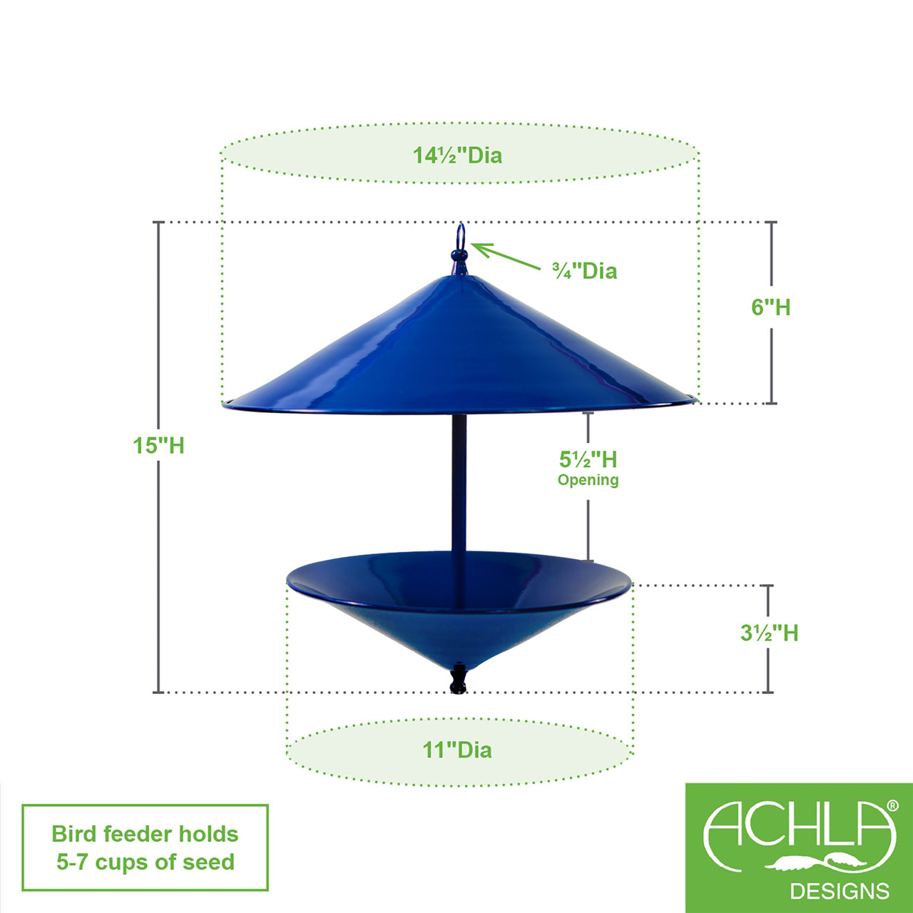 An ideal complement for a mid-century home or modern garden landscape, the conical design of this birdfeeder serves to protect birds and seeds from drizzle, as well as deter squirrels from joining the buffet. Made of galvanized steel with a bold blue powder coated finish, the simple modern designs fits with a mid-century home or contemporary landscape.