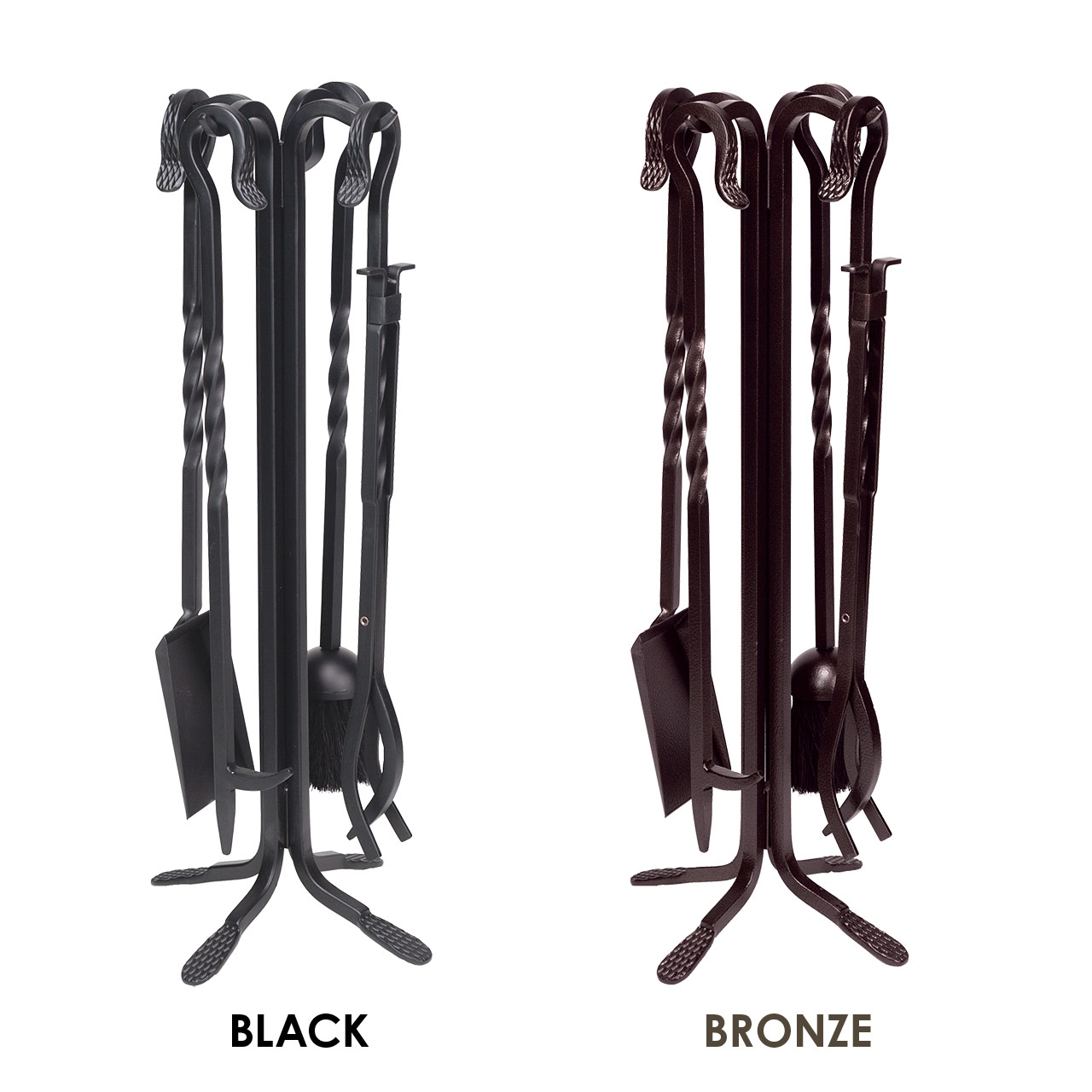 The Dagan Five Piece Wrought Iron Fireplace Tool Set combines elegance and durability to enhance any fireplace space. Crafted from wrought iron with a black or bronze finish, this five-piece set is built to last. The welded center stand comes fully assembled, while the 3/4-inch thick twisted handles add a stylish touch. The set includes a brush, poker, shovel, tong, and stand—providing everything needed to keep your hearth clean and organized.