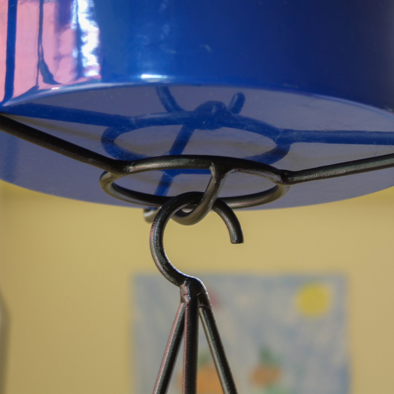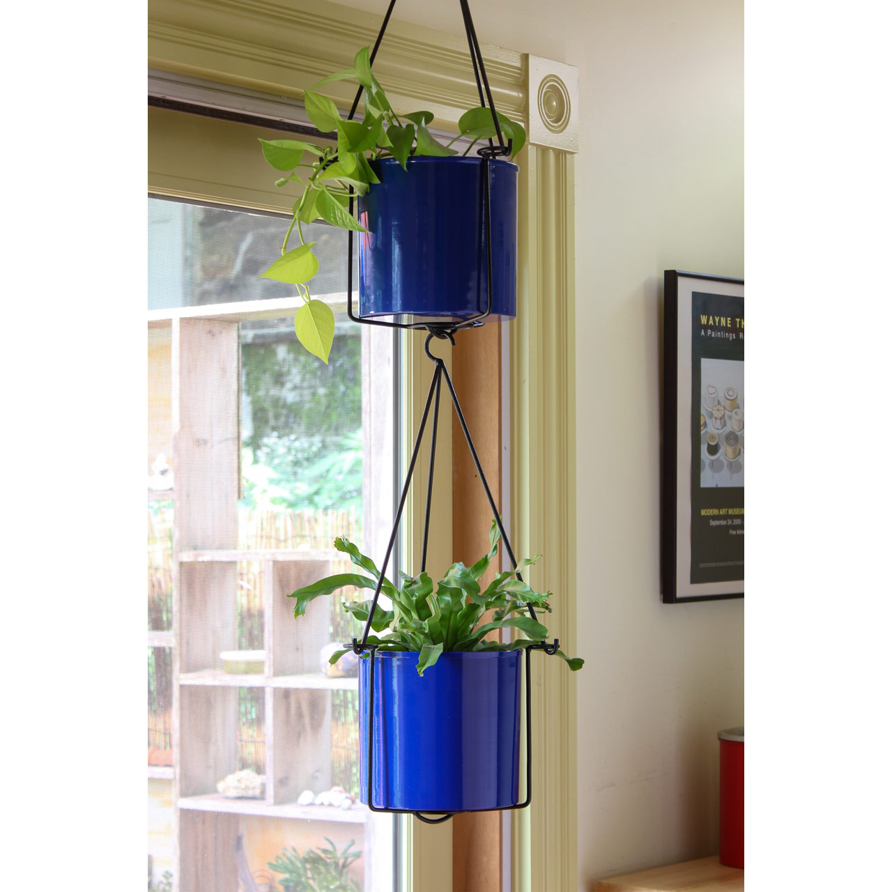 The Vera Planter is a contemporary style plant hanger for the modern home or container garden, with attractive design that is simple and practical in its ease of use. Slip the planter into the basket, hook the end of each rod into the three loops and hang from the hook at the top. Cylindrical planting pots included are made of galvanized steel with Burnt Sienna patina or French Blue powder coating, have removable drainage plugs. Cross-bar provided at the base allows planters to be linked in a vertical arrangement or hang individually from top hanging hook. Made for indoor and outdoor use and powder coated for weather resistance.